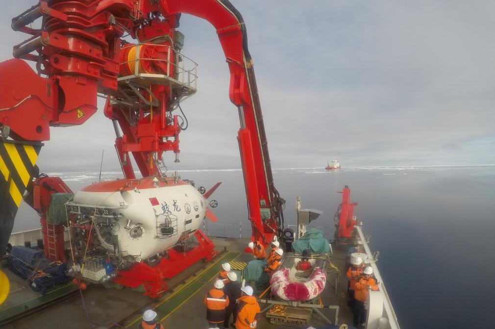 “蛟龙”号在北冰洋进行首次下潜,“雪龙2”号提供保障支持。新华社记者 刘诗平 摄