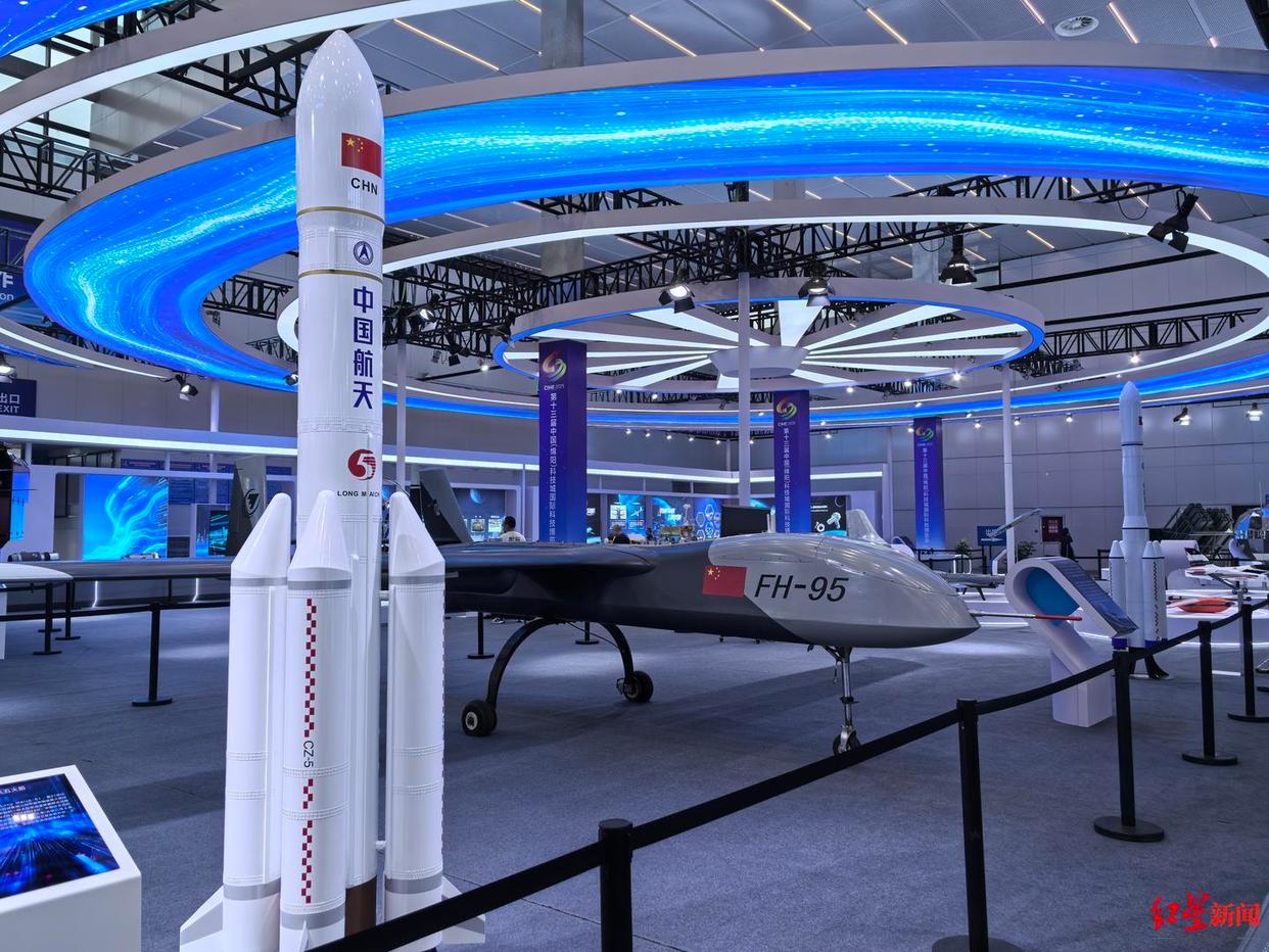 在国防科技工业先进技术成果展区,负责执行中国第一次火星探测任务的天问一号、FH-95中远程多用途无人机系统、北斗组网、低空监视雷达、天幕反无人机系统、无人机防控指挥车等科技成果悉数亮相。