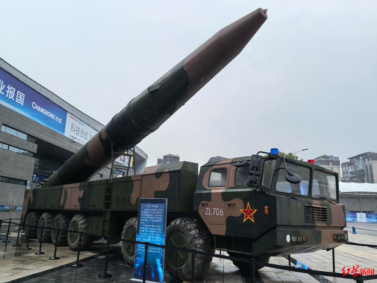 A馆是本次科博会科技创新成果主题馆。在场馆门口,东风-26导弹十分吸睛,吸引不少人驻足拍照打卡。东风-26导弹是中国自主研制的新一代中远程导弹,具备核常兼备、慑战一体的能力,既可搭载核弹头实施战略威慑,也可装备常规弹头执行精确打击任务。