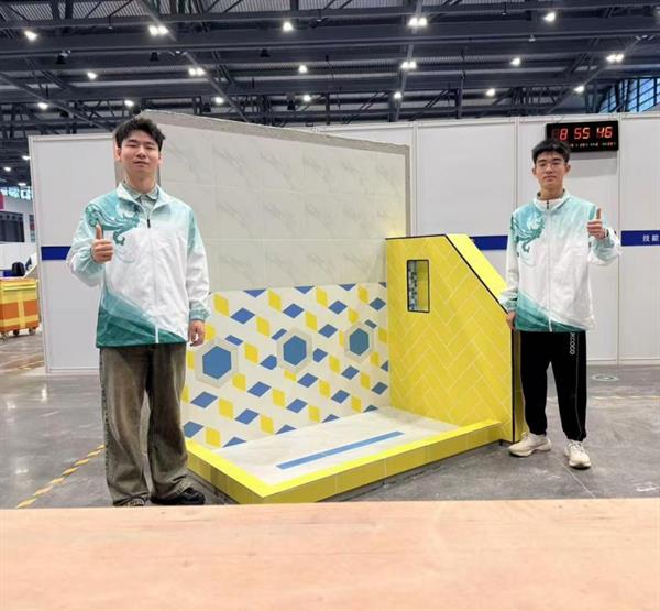瓷砖贴面赛项,建筑设计学院学生徐振皓荣获全国第七名,晋级国家集训队。17小时,分秒必争,团队以专注与执着“砖”注完美。从瓷砖精准切割,到细致镶贴,每一道工序都挑战着毫米级难度。他们用一块块瓷砖,精心拼贴,将匠心的极致精度展现得淋漓尽致。