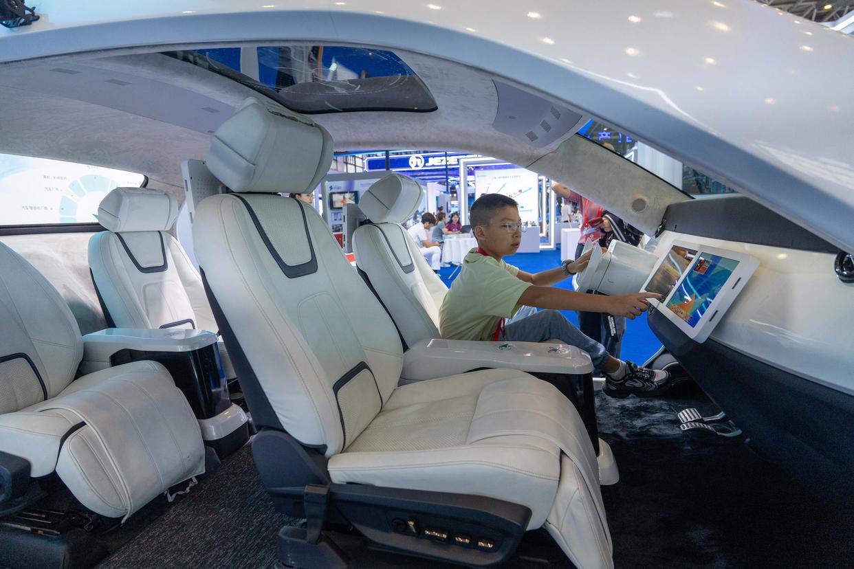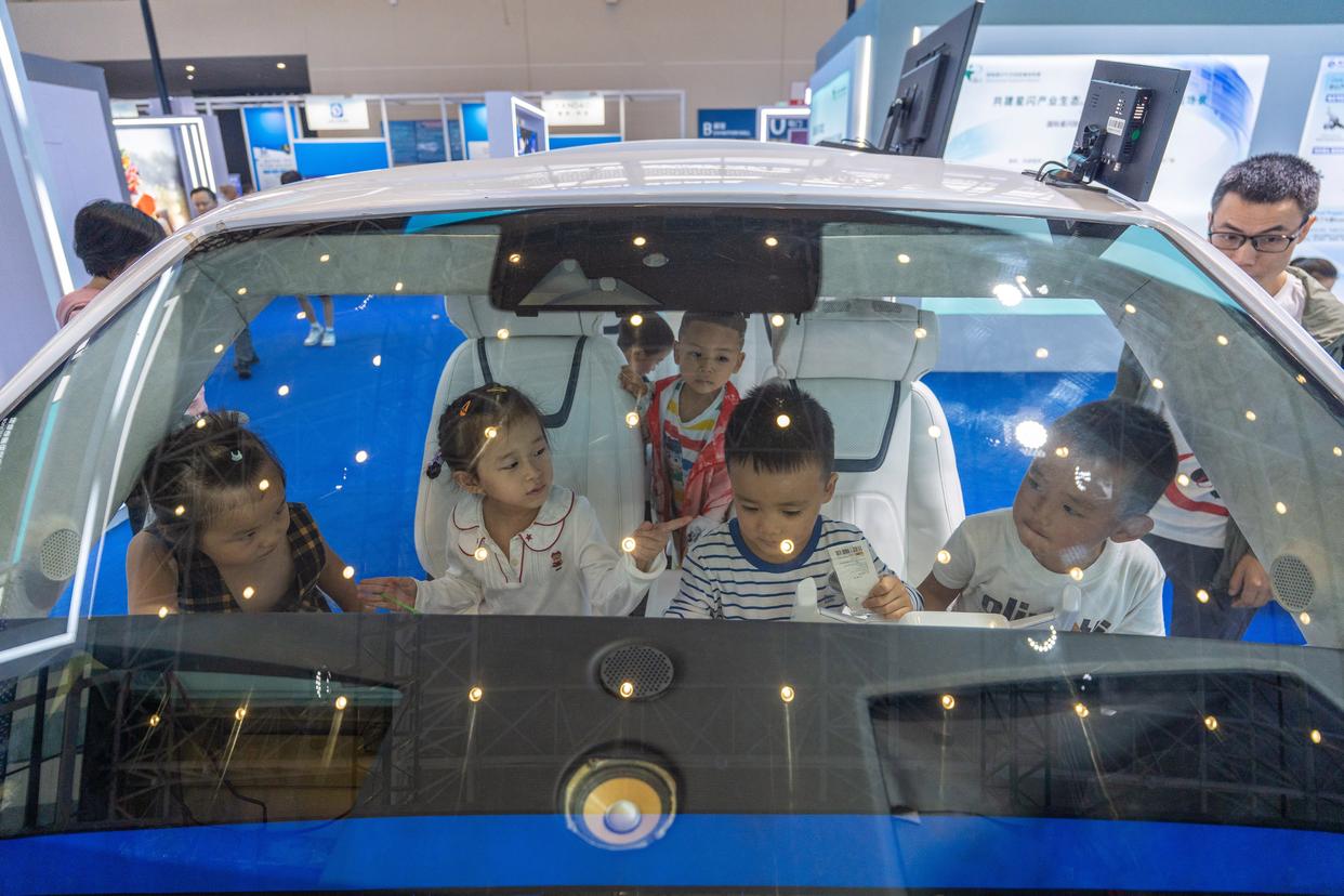 9月27日,在第十三届中国(绵阳)科博会上,小观众在参观未来概念汽车内部。新华社记者 薛晨 摄