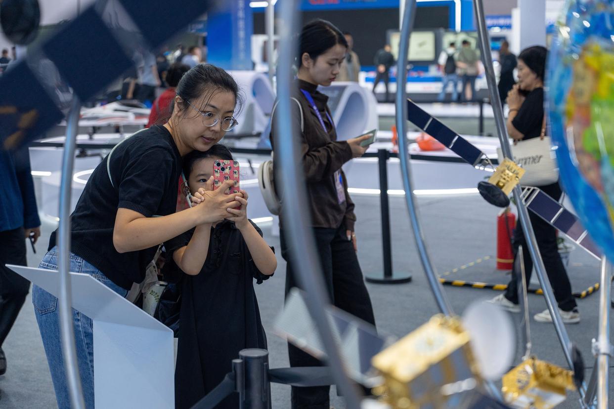 9月27日,在第十三届中国(绵阳)科博会上,小观众在拍摄北斗卫星导航系统模型。新华社记者 薛晨 摄