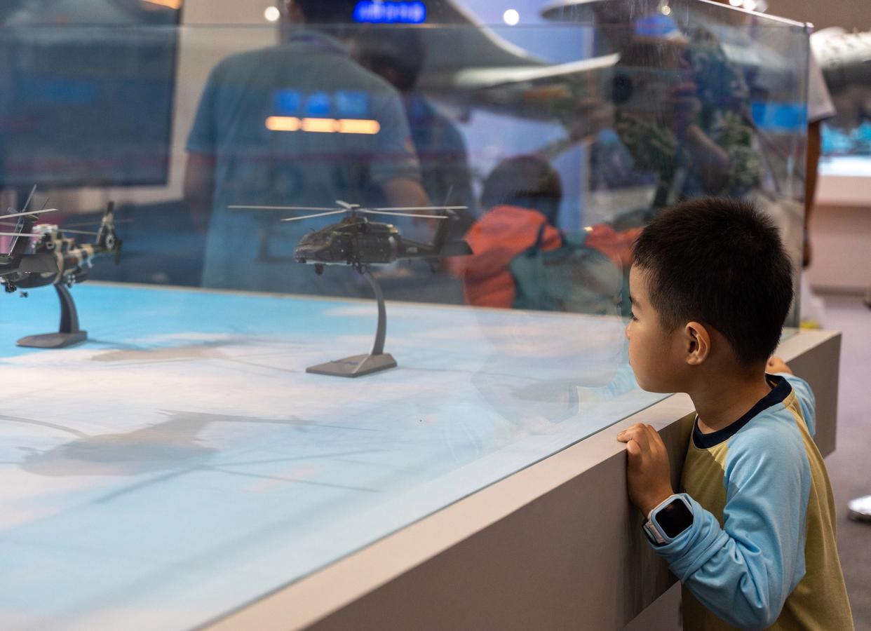 9月27日,在第十三届中国(绵阳)科博会上,小观众在欣赏直升机模型。新华社记者 薛晨 摄