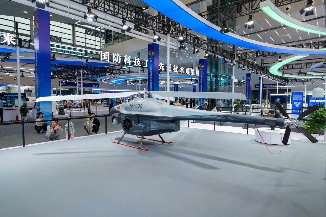 9月27日拍摄的科博会上展出的FH-909无人直升机。该机主要为解决高原运输投放“最后一公里”的问题。新华社记者 薛晨 摄