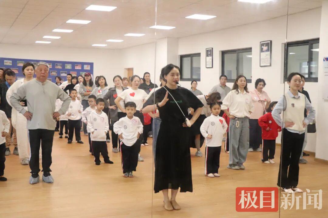 瞧,舞蹈教室里,音乐组李萌老师正带领同学们做热身运动。热身结束后,大家手拉手围成一个个小圆圈,跟着李老师学习活泼有趣的亲子圆圈舞。