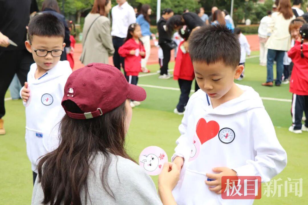 大课间活动最后,家长们从观礼区走到孩子身边,用掌声和竖起的大拇指为孩子们喝彩,孩子们则小心地取出爱心贴纸贴在父母身上。