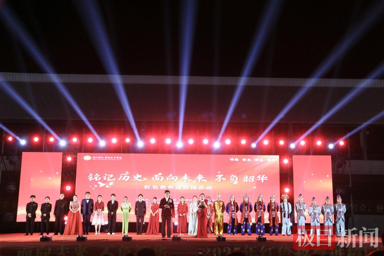 主题报告后,省演艺集团的艺术家们为师生带来了一台展现奋斗史诗的文艺演出。歌舞、汉剧、评书、武打等节目轮番上演,艺术表达与红色主题交相辉映,相得益彰。演员们以精湛的功底与真挚的情感,一次次将现场气氛推向高潮,掌声如潮,经久不息。