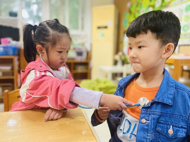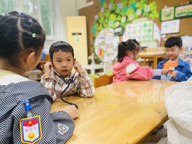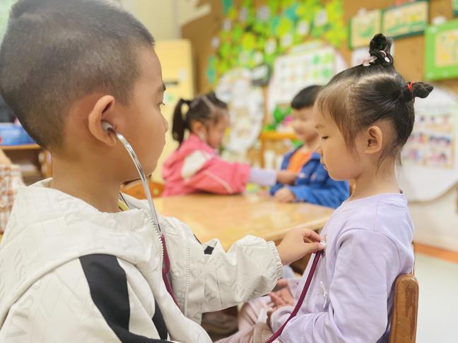 随后,最受期待的“听诊器探秘”环节开启。胡老师为孩子们分发儿童专用听诊器,引导他们两两一组,轻轻将听诊器贴在同伴的胸口,认真聆听“咚咚”的心跳声。“我听到啦!像小鼓在敲!”“他的心跳和我的一样快吗?” 孩子们兴奋地分享着自己的发现,在互动中加深了对心脏的认知。