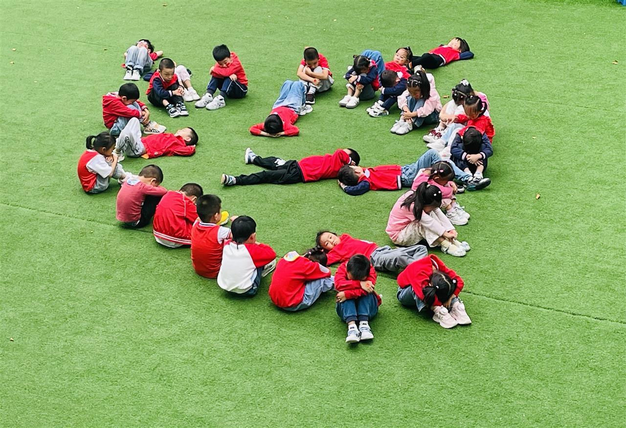 活动最后,孩子们穿上鲜艳的红色衣服,在韩瑜老师的带领下来到幼儿园草坪。大家手拉手围成圆圈,再慢慢调整位置,共同摆成一颗大大的 “心脏” 形状。随后,孩子们轻轻躺在草地上,闭上眼睛,双手放在胸口,静静感受自己心脏的跳动。