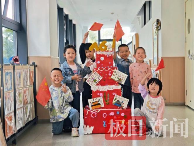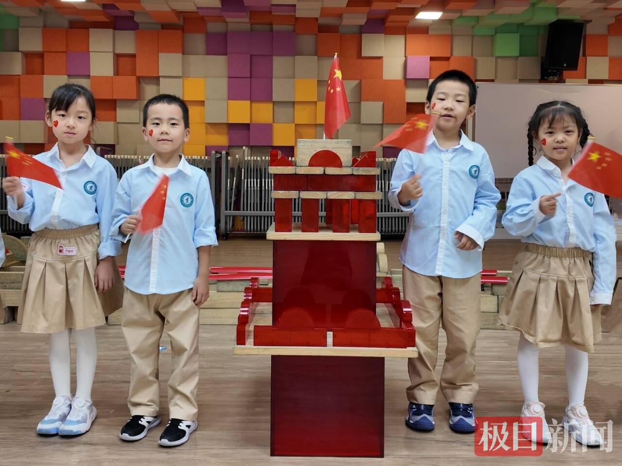 一江璟城园幼儿搭建长城,用一块块积木连起对祖国的祝福
