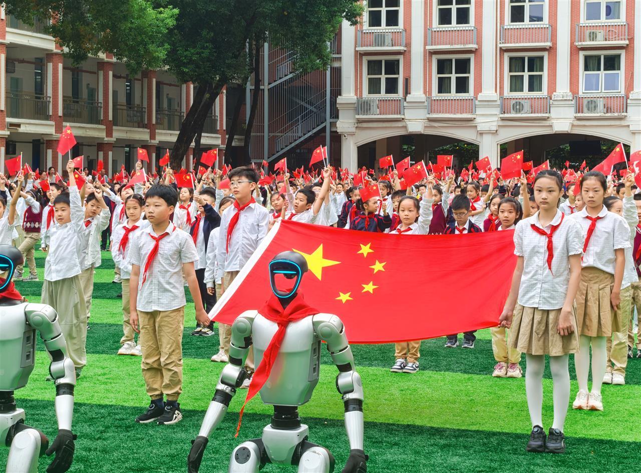 在中华人民共和国成立76周年即将到来之际,9月29日清晨,武汉市硚口区实验小学将校园打造成充满未来感的“科技爱国”主题营地,精心举办“敬礼,中国!”科技主题升旗仪式,为全体学生呈现了一堂“可触摸、可感受、可共鸣”的沉浸式科技爱国课。