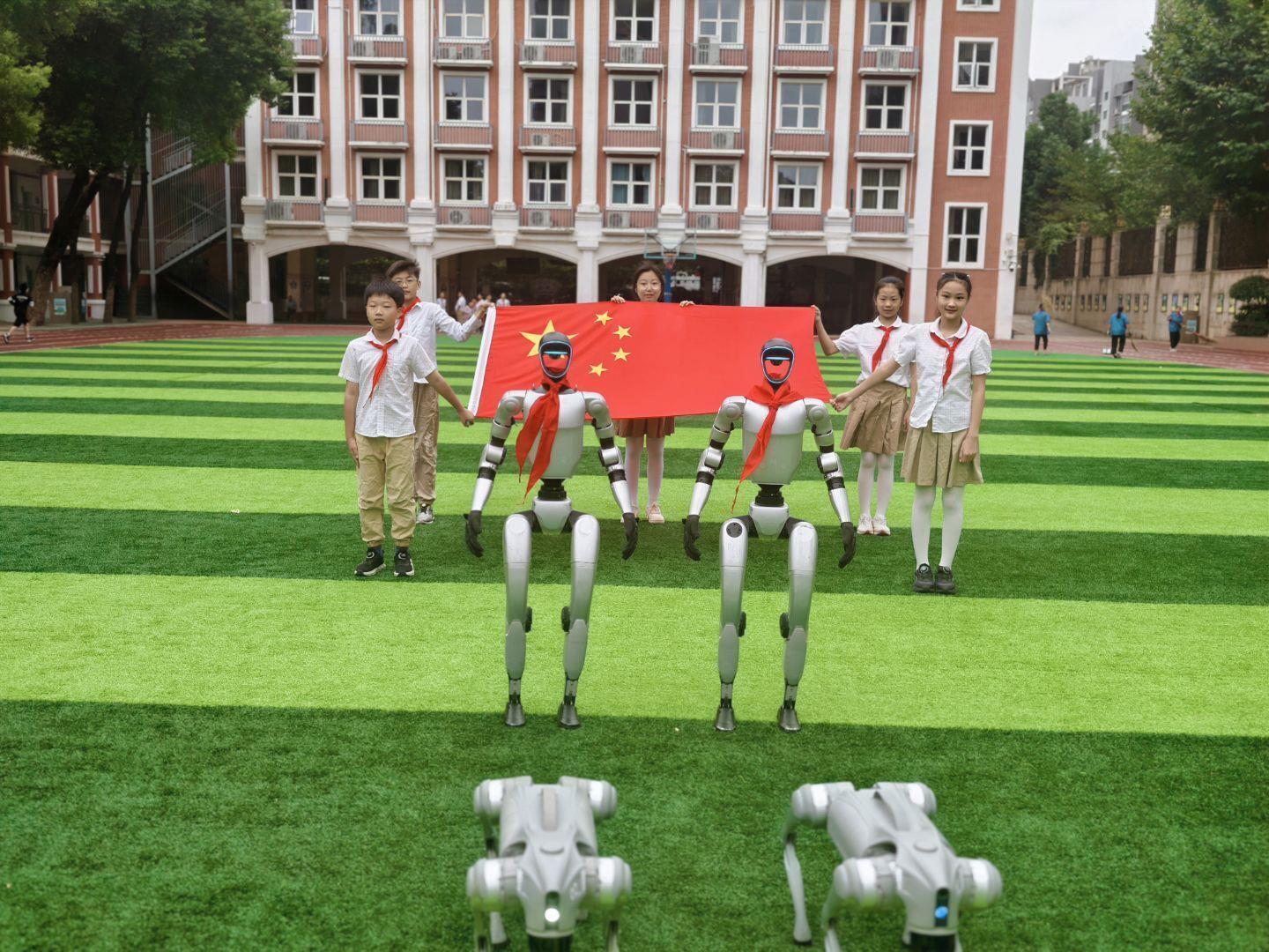 清晨7时40分,学校校门口已热闹非凡。由智能机器人与机器狗组成的“机甲天团”一亮相,便凭借精准的握手动作、温暖的拥抱姿态和灵活的跳跃表现,瞬间点燃现场氛围,引发同学们阵阵惊叹。孩子们手持小国旗,主动上前与“机甲伙伴”互动,有的并肩敬礼,有的握手问好,用充满童真的方式传递对祖国的祝福。