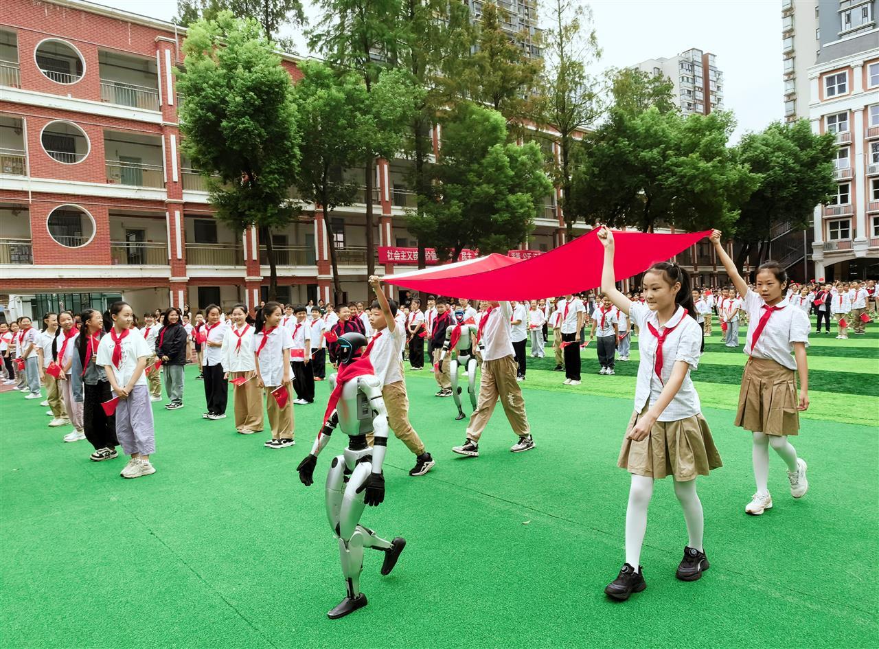 国旗下讲话环节,大队辅导员胡钰婷老师寄语同学们:“从九三阅兵式上捍卫和平的‘大国重器’,到今天我们身边共创未来的智能伙伴,都在告诉我们一个真理——唯有自身强大,才能屹立不倒!此刻我们与机器人同行致敬祖国,未来创造中国奇迹的重担,终将落在你们这些新时代少先队员肩上!”话语间满是对少年们的期望,也让“科技强则国家强”的理念深入人心。