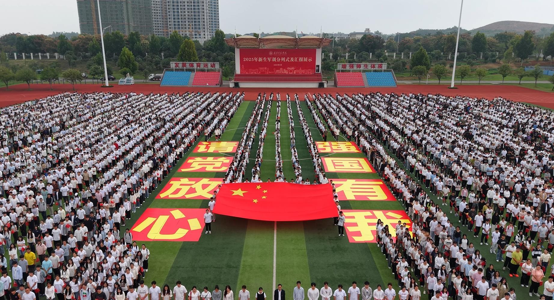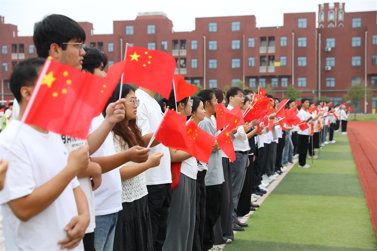 与此同时,在田径场中央,学子们共同擎举起巨幅五星红旗,向新中国成立76周年华诞献礼。巨幅标语“我爱中国”“请党放心、强国有我”在队列中依次展开,字字千钧,充分展现了新时代青年将爱国之心、强国之志、报国之行融入血脉的坚定信念与坚强决心。