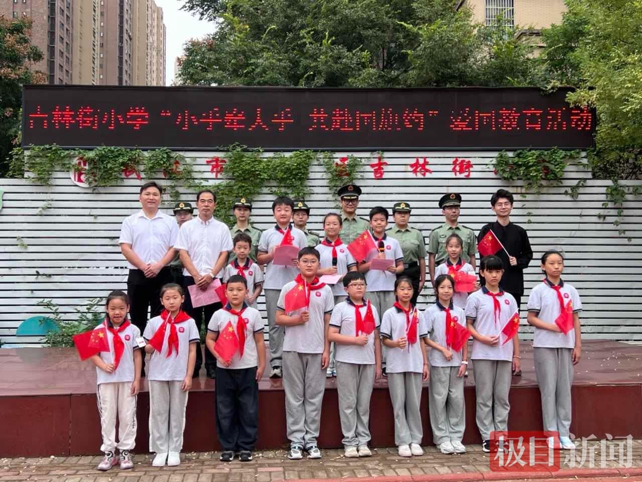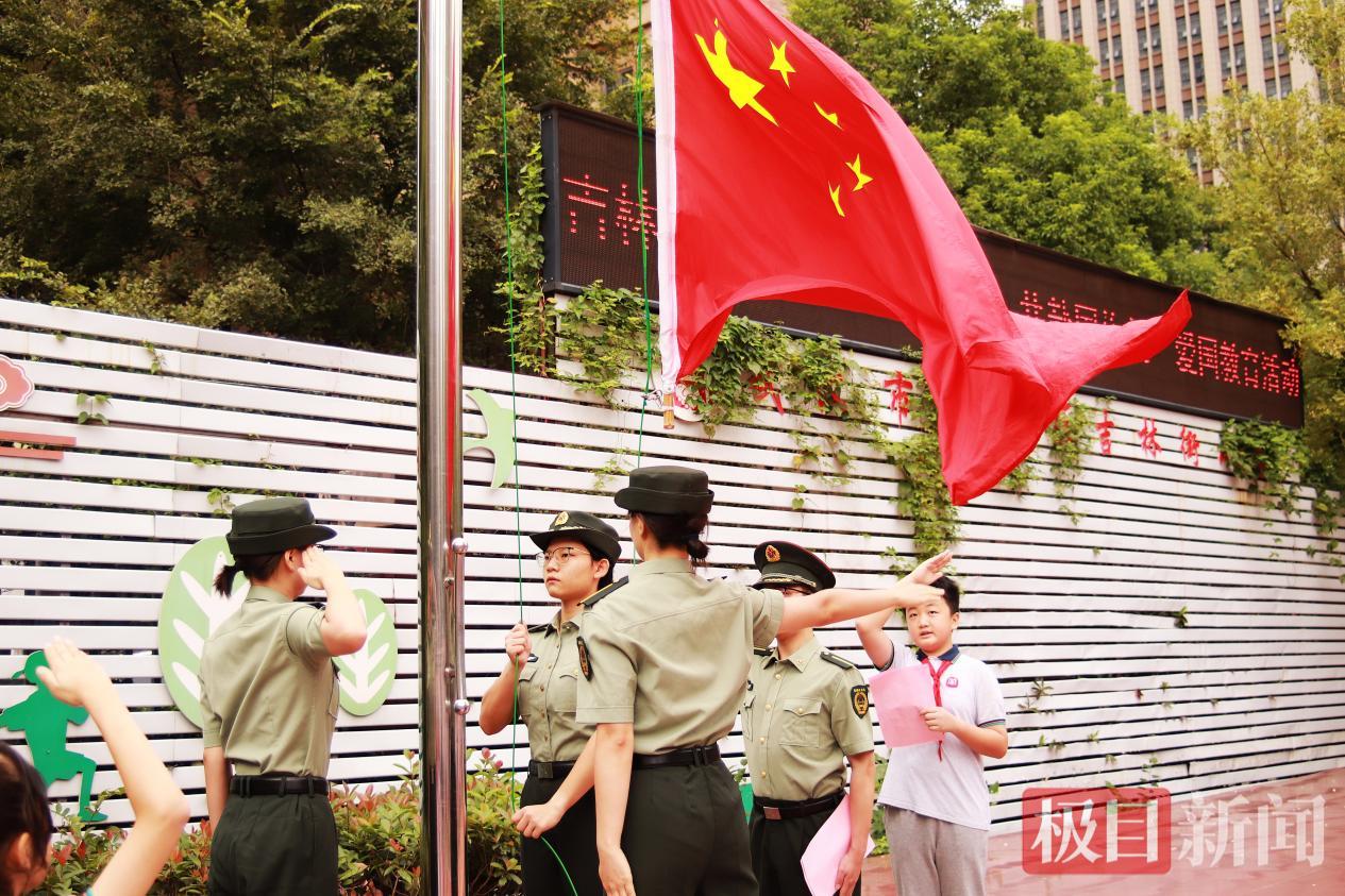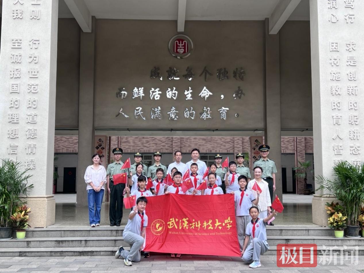 活动在庄严的出旗仪式中拉开帷幕。武汉科技大学国旗班成员身着笔挺制服,迈着铿锵有力的正步走向旗杆,两名吉林街小学的护旗手神情庄重,与大学生们并肩同行,小小的身影里透着对国旗的无限崇敬。随着激昂的《义勇军进行曲》奏响,五星红旗冉冉升起,在场的大小学生与教师代表全体肃立,齐声高唱国歌,嘹亮的歌声回荡在校园上空,爱国之情在每个人心中激荡。