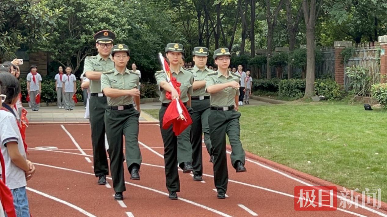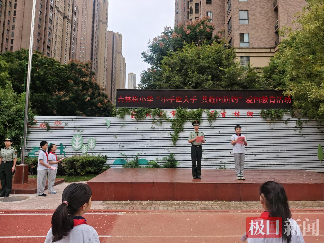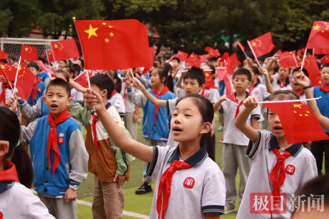 活动在庄严的出旗仪式中拉开帷幕。武汉科技大学国旗班成员身着笔挺制服,迈着铿锵有力的正步走向旗杆,两名吉林街小学的护旗手神情庄重,与大学生们并肩同行,小小的身影里透着对国旗的无限崇敬。随着激昂的《义勇军进行曲》奏响,五星红旗冉冉升起,在场的大小学生与教师代表全体肃立,齐声高唱国歌,嘹亮的歌声回荡在校园上空,爱国之情在每个人心中激荡。