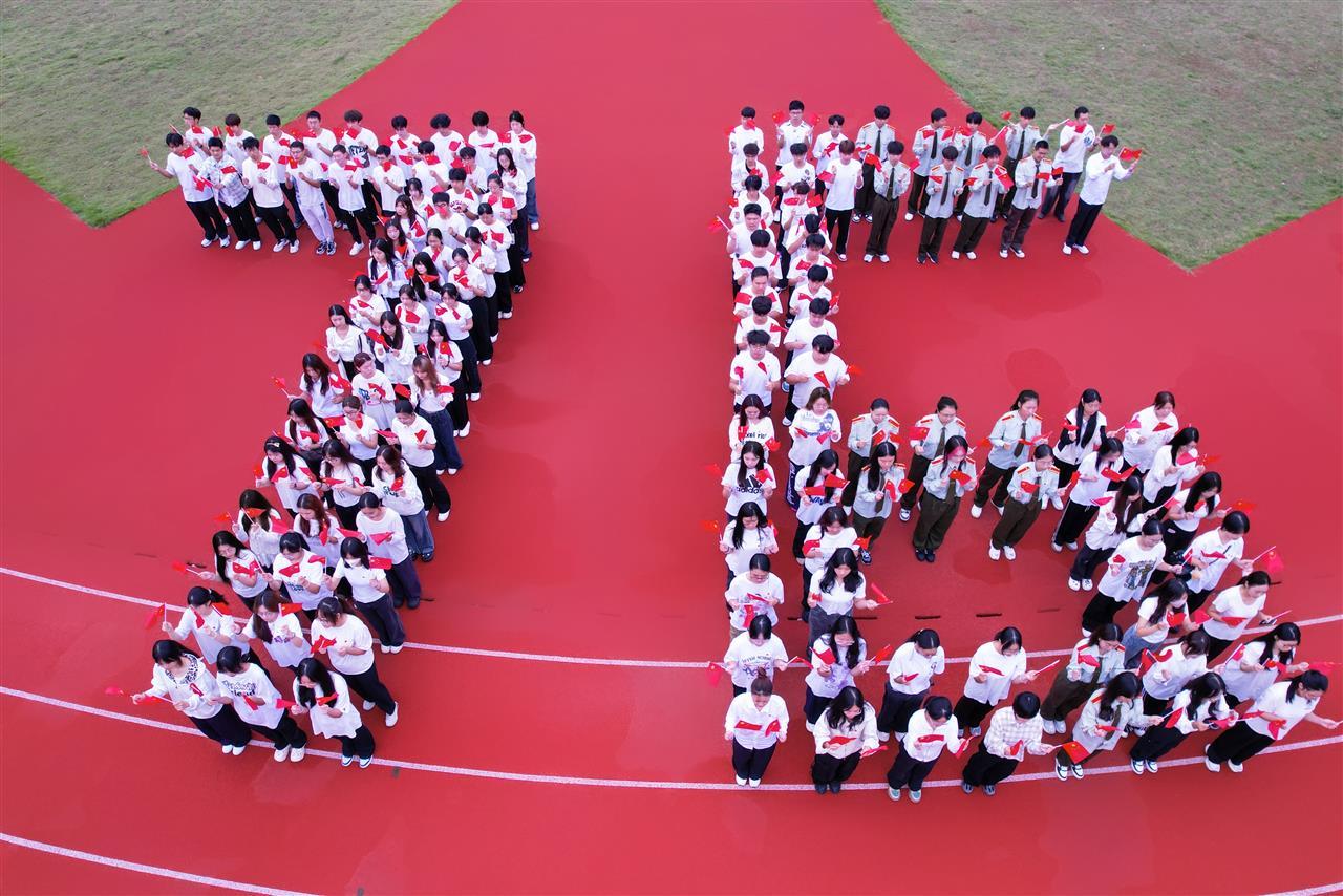 升旗仪式过后,全体学生用响亮的声音齐声欢呼:“祖国生日快乐,我爱你!”并摆出数字“76”的字样,表达对祖国母亲深深的热爱。