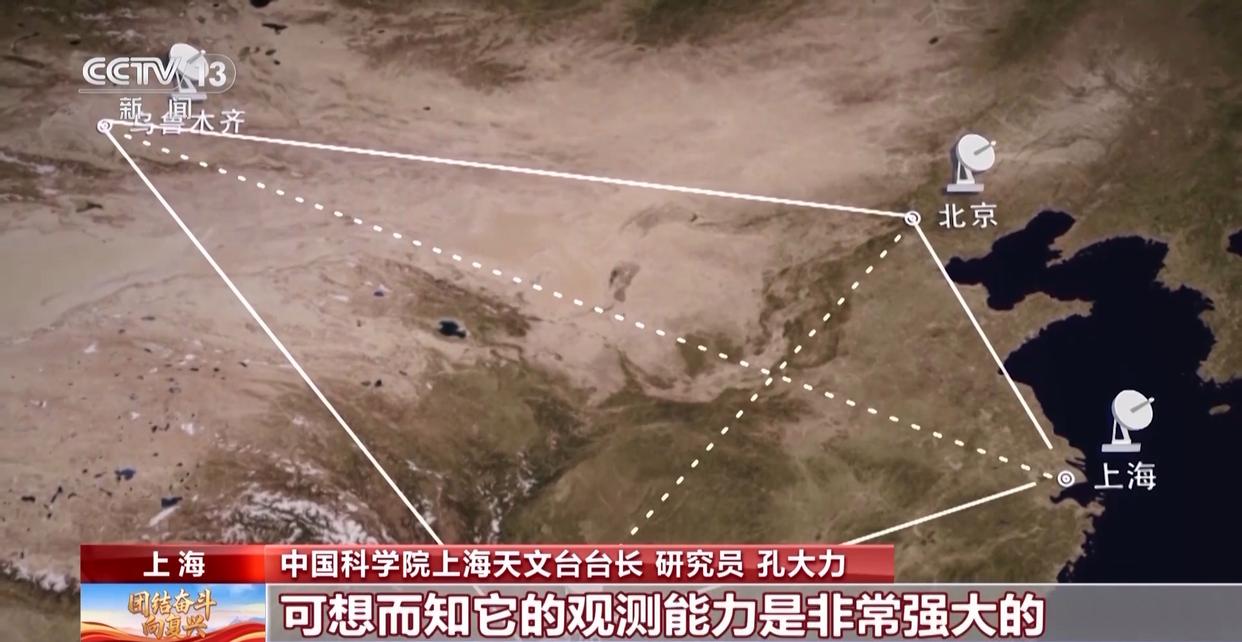 中国科学院上海天文台台长 研究员 孔大力:大型高性能的现代化射电望远镜,构成了一张覆盖我们中国国土的观天巨眼,相当于建设了一台等效于和我们中国领土面积这么大的一台望远镜,可想而知它的观测能力是非常强大的。