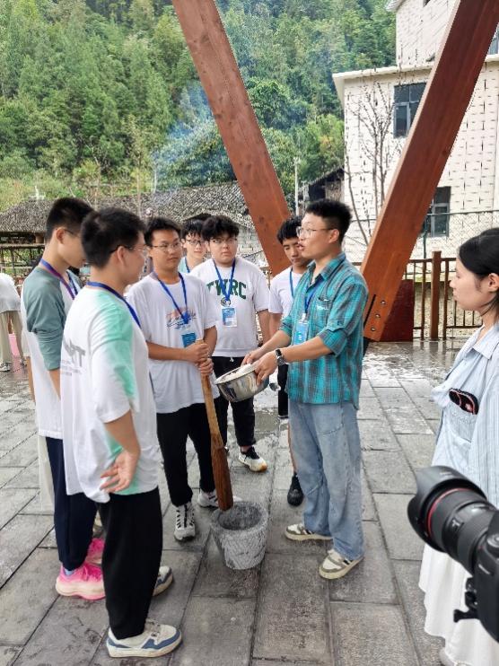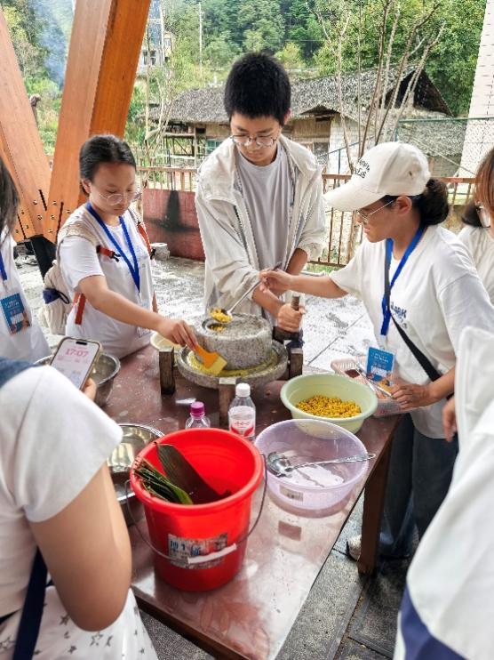 “捶糍粑要用力!大家一起喊号子!”节日的彭家寨营地内,《打糍粑》课程现场一片热闹。藏族学生嘎玛曲珍挽起袖子,和汉族学生一起抡起木槌,对着石臼里的熟糯米反复捶打。木槌起落间,糯米渐渐变得软糯,嘎玛曲珍擦了擦汗:“在家乡我们做糌粑,用的是石磨;这里做糍粑用木槌,虽然工具不一样,但大家一起动手的快乐是一样的!”