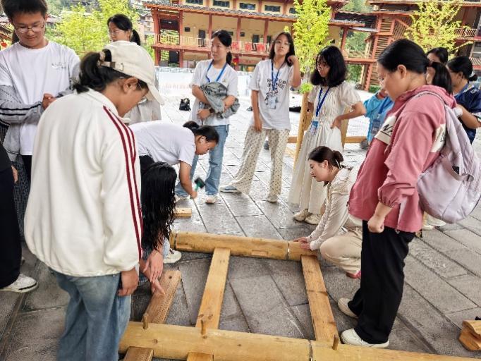 学生江永西卓与学生饶诗敏一组,从分辨榫卯构件到协作搭建模型,指尖的配合逐渐默契。“第一次见这样的房子,和家乡的藏式碉楼不一样,但都特别神奇!”江永西卓捧着共同完成的模型说,“搭的时候饶诗敏教我认‘穿斗结构’,我跟她讲家乡房子的石头工艺,原来不同民族的智慧能这么好地交流。” 课后,师生还一同探访古寨街巷,听土家老人讲述吊脚楼里的民俗故事,在青瓦木栏间感受“各民族文化都是中华文化重要组成部分”的深刻内涵。