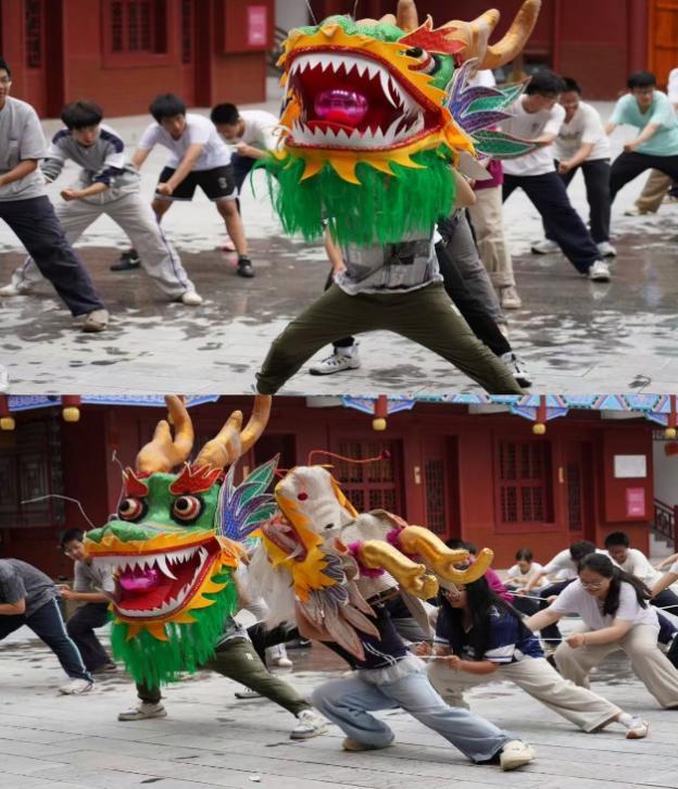 随后,师生前往县民宗局摆手堂,体验摆手舞和地龙灯舞两项非遗文化。在摆手堂里,非遗传承人耐心地教大家摆手舞的基本动作。同学们跟着传承人,或摆臂,或踢腿,虽然一开始动作还有些生疏,但在互相学习、互相鼓励下,渐渐有了模样。来自西藏的嘎玛曲珍同学笑着说:“摆手舞的动作很有节奏感,跳起来很有意思,感觉能从中感受到土家同胞的热情。”地龙灯舞的学习同样充满乐趣。传承人舞动着地龙,那灵活的姿态仿佛真的地龙在眼前游动。同学们仔细观察,然后尝试模仿。大家相互配合,操控着地龙道具,尽管过程中难免出现小失误,但现场始终洋溢着欢乐的氛围。在学习非遗文化的过程中,各族学生相互交流、相互帮助,进一步拉近了彼此的距离,也让民族融合的纽带更加紧密。