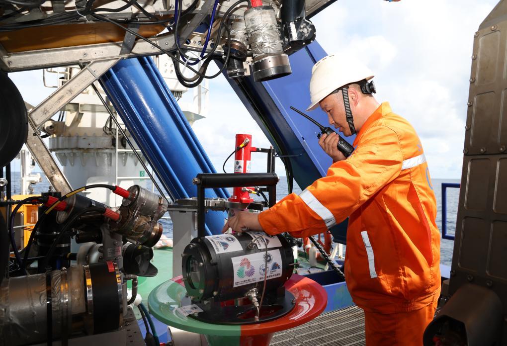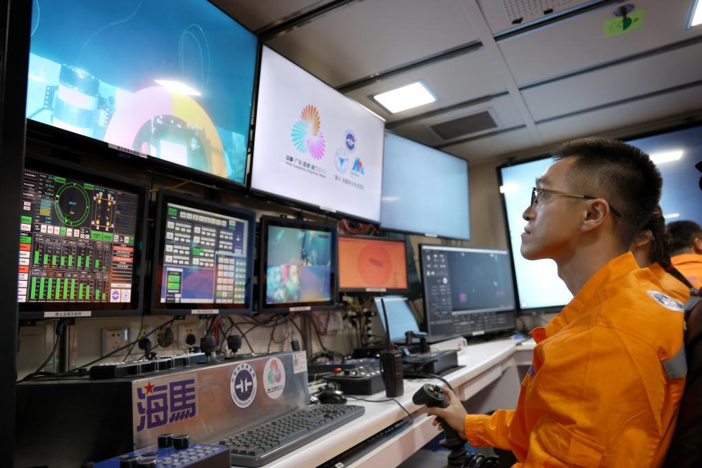 工作人员遥控采火装置在海底进行作业。新华社记者 卢汉欣 摄