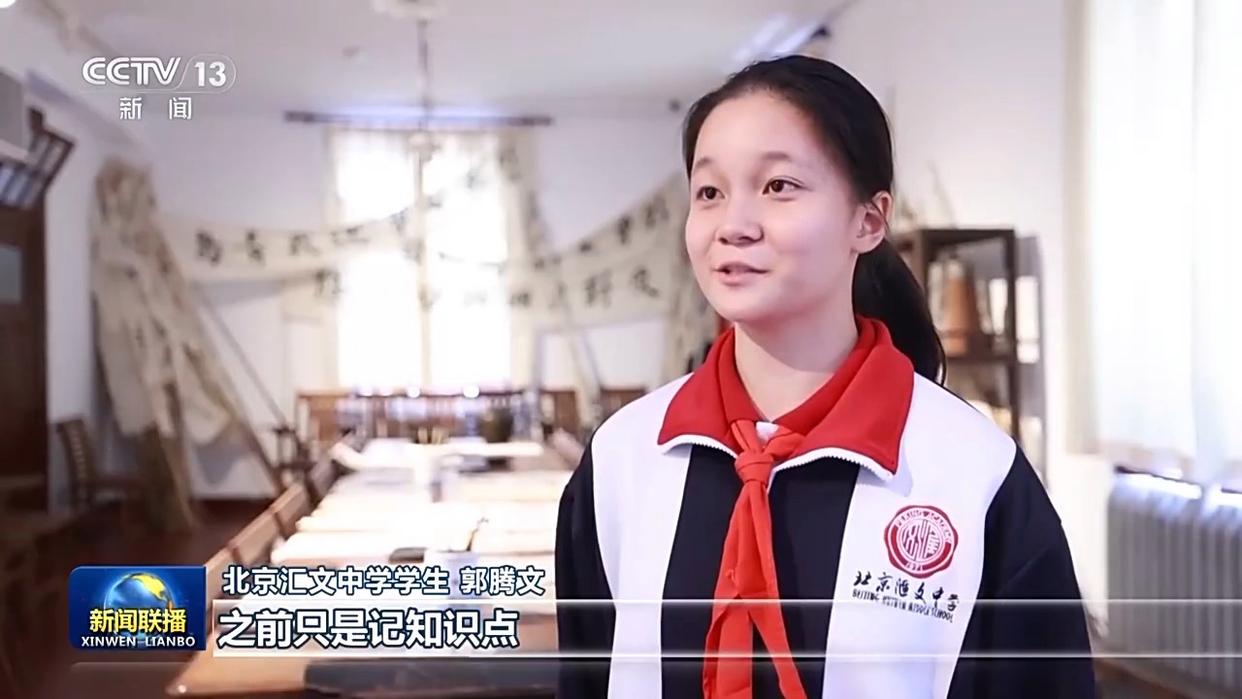 北京汇文中学学生 郭腾文:课本中读到过五四运动,之前只是记知识点,现在站到了这里,真的懂得了那种为国家寻出路的热血。