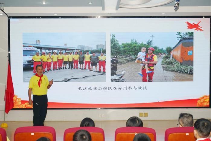 10月9日,武汉市武昌区中华路小学金都校区一楼阶梯教室内队旗飘扬,气氛庄重热烈,“强国复兴有我 争当新时代好少年”少先队建队纪念日主题活动在此举行。长江救援志愿队代表受邀走进校园,通过宣讲与互动,为队员们带来一堂生动的国防思政课。