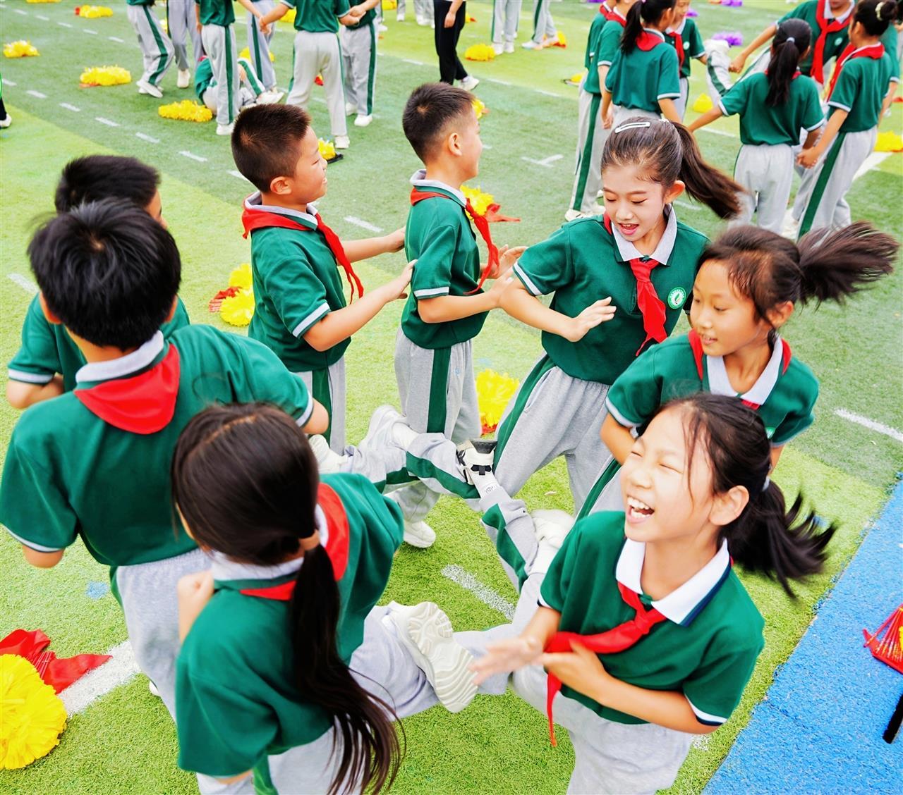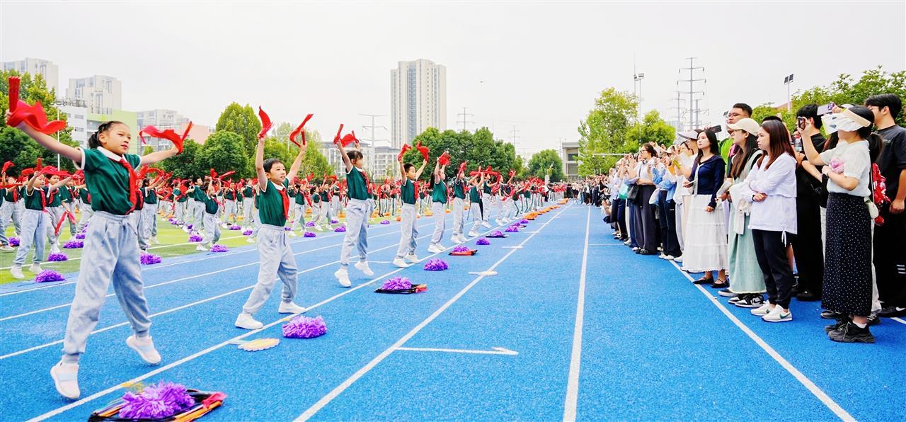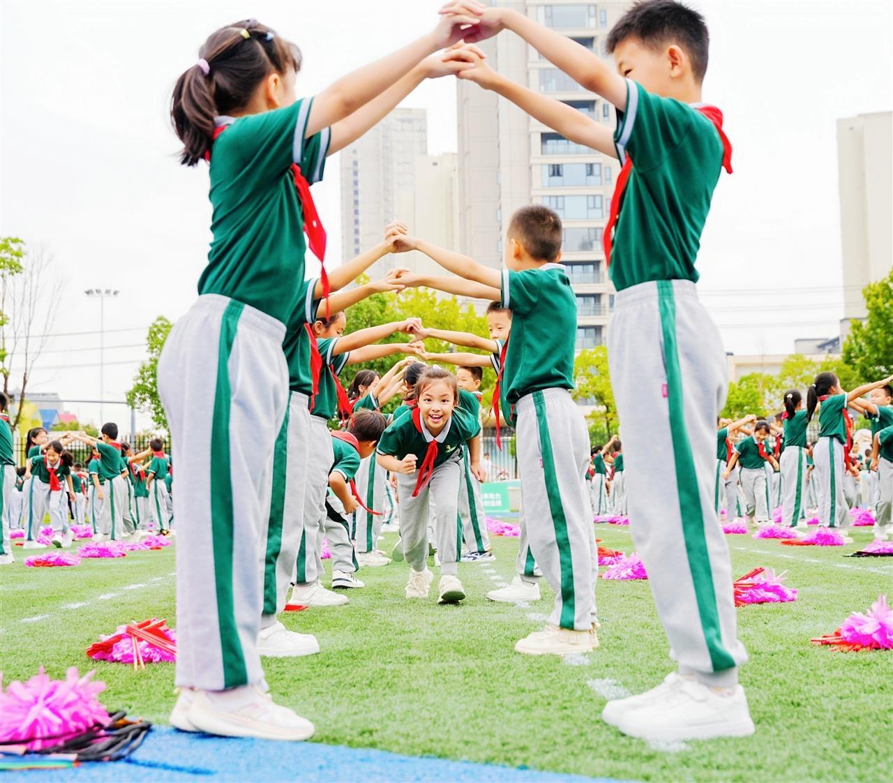 她介绍,光谷十四小大课间活动的分层设计充分体现了科学适配原则,构建了“文化传承+审美赋能+体能挑战”三位一体的特色大课间课程链。其中“筷子操”以蒙古族筷子舞动作为基础,融合击肩、击胯、打地等传统元素,让学生在节奏明快的敲击声中感受民族文化的豪迈与洒脱。通过多种队形变化,既增强了学生身体的协调性与节奏感,也增强了民族文化的认同与团队合作的凝聚力。“花球啦啦操”结合各色花球的视觉冲击力,设计多层次队形变换,通过动态流动与空间转换,通过中高强度的整套操练习,既提升学生肢体的力量、速度、灵敏等素质,也增强了孩子们的表现力、节奏感和审美素养。动作创编注重力度与柔韧的结合,充分展示学生的“健与美”的动作呈现,回应了“以体健身、以体润心”的育人目标。“体能游戏”依据学生年龄特点设计差异化游戏模块,如“绳梯敏捷挑战”、“翻山越岭”等趣味体能,融入跑、跳、支撑、爬等基本动作技能,通过情境化、游戏化的多种身体练习,激发学生的参与热情和团队合作,在趣味竞争中夯实体能基础。
