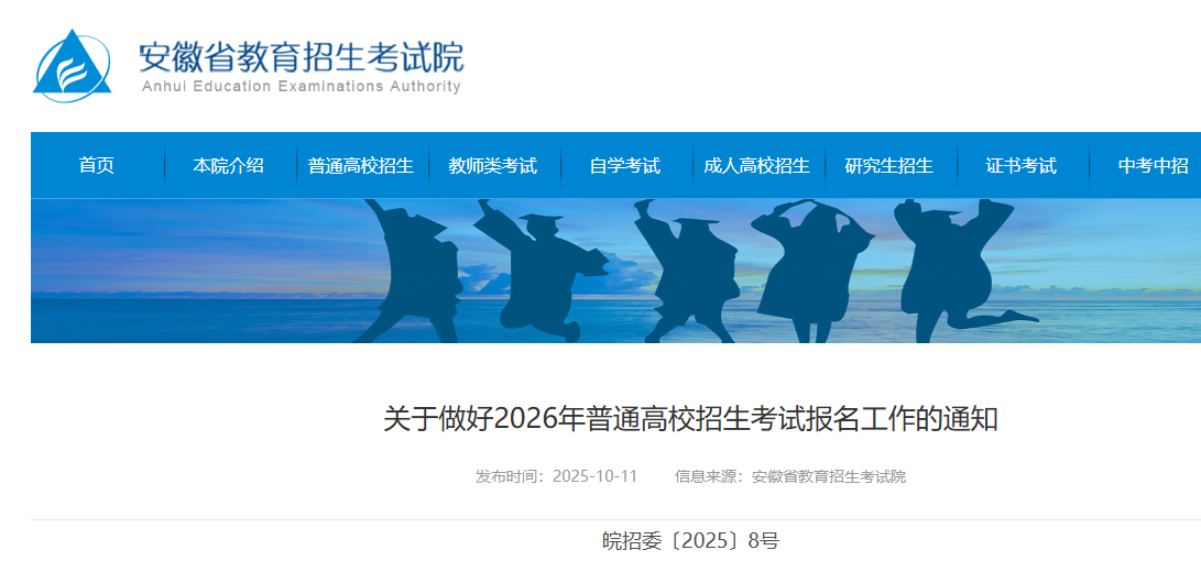 大皖新闻讯近日, 安徽省高等学校招生委员会、安徽省教育厅发布关于做好2026年普通高校招生考试报名工作的通知。据通知,我省2026年普通高考网上报名时段为2025年10月17日10:00至10月21日17:00。