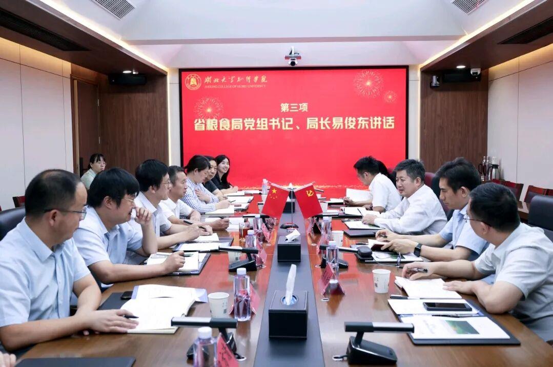 高连顺首先代表学校对易俊东局长一行的到来表示热烈欢迎,向省粮食局长期以来对学校事业发展的关心支持表示衷心感谢。他表示,湖北大学知行学院前身为湖北省粮食学校,双方历史渊源深厚,合作基础好,在涉粮专业人才培养、科技成果转化、职业技能鉴定、粮食安全科普宣传等方面合作成效显著,学校将赓续与粮食行业的血脉联系,聚焦粮食行业需求,坚定不移服务粮食安全与粮食产业发展,进一步凝练涉粮专业特色和优势,加强涉粮专业建设,为推进科技兴粮、人才兴粮作出新贡献。院长何顺进重点汇报了学校涉粮专业建设基本情况和下一步重点工作思路举措,并结合湖北大学和知行学院学科及师资优势,提出了深化合作的相关建议。