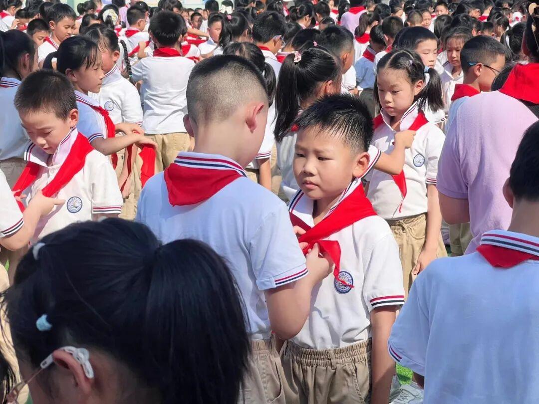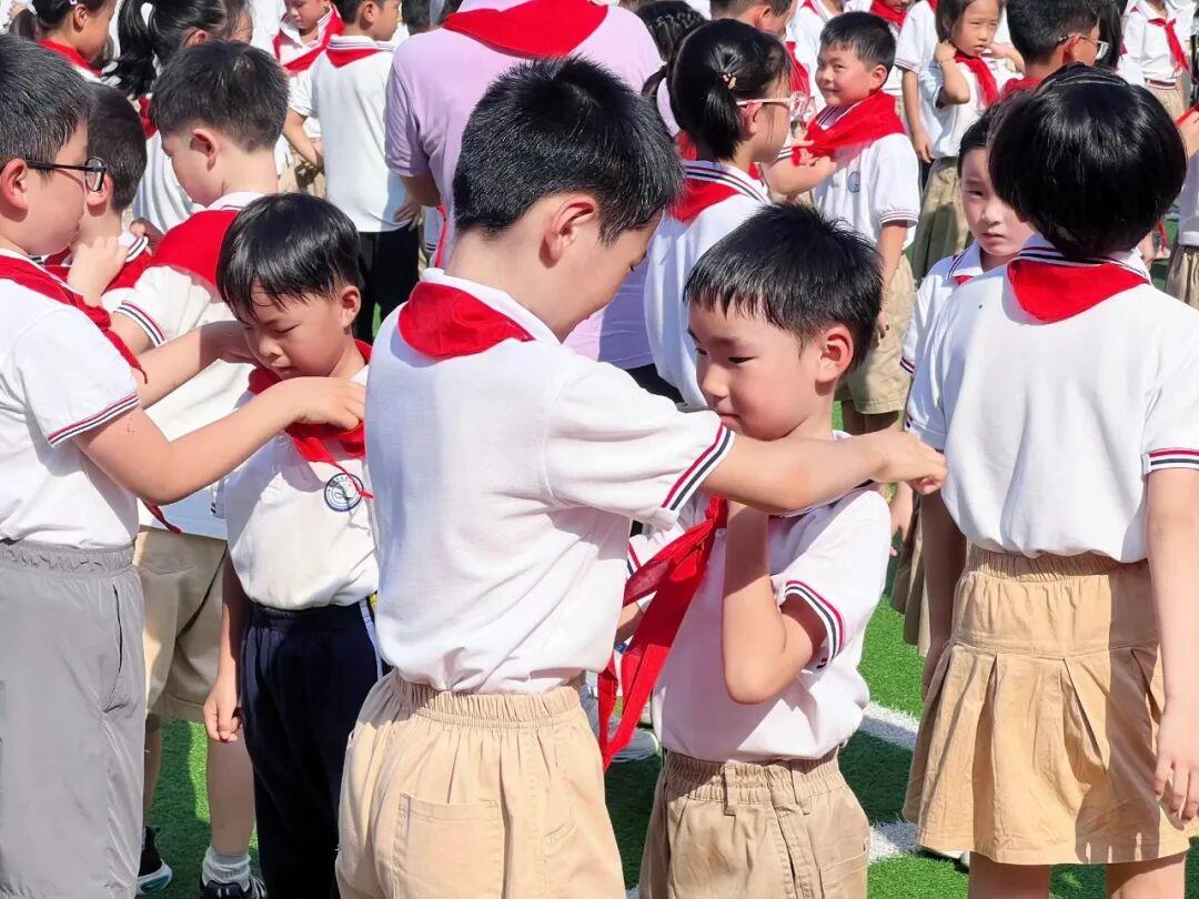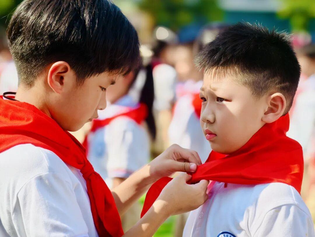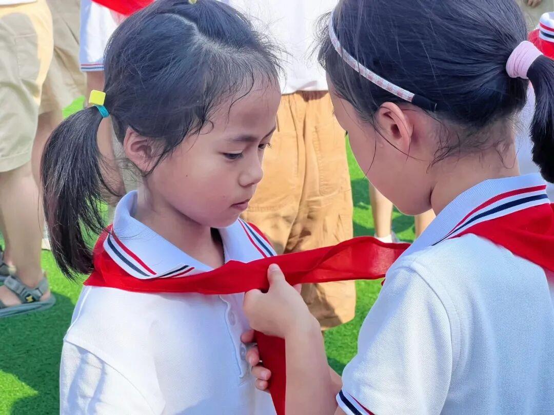 最令人期待的时刻到来啦!高年级的哥哥姐姐们手捧鲜艳的红领巾,细心为新队员佩戴。当那抹革命先烈用鲜血染成的红色在胸前飘扬,新队员的脸上洋溢着激动与自豪。