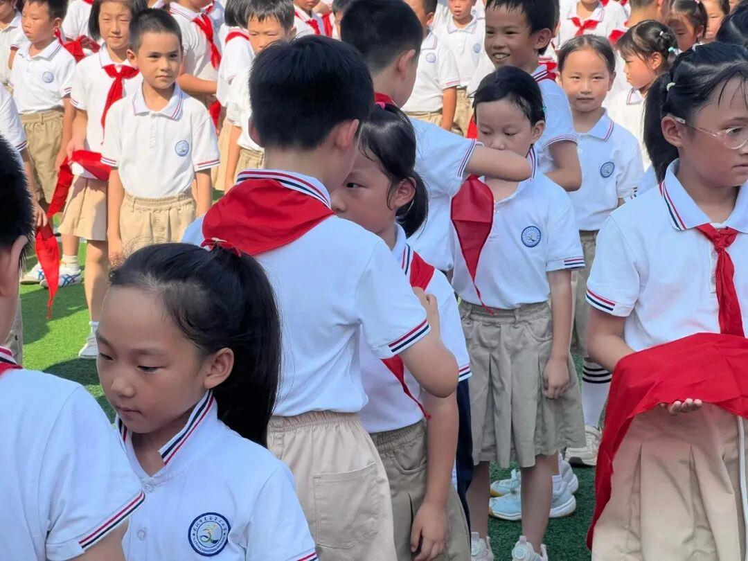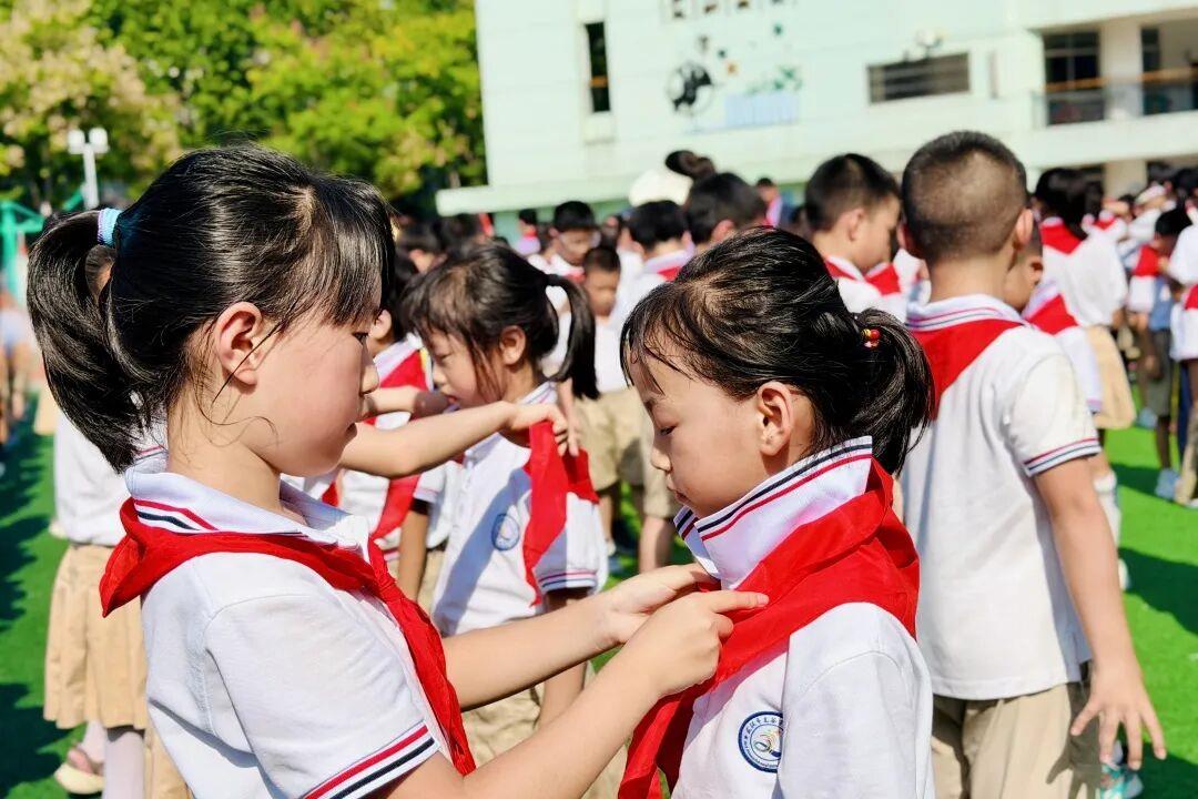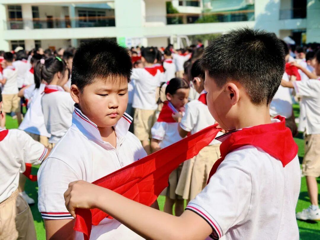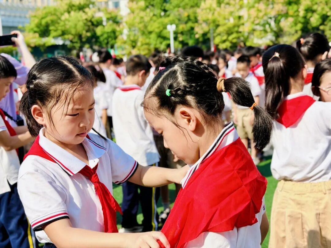 最令人期待的时刻到来啦!高年级的哥哥姐姐们手捧鲜艳的红领巾,细心为新队员佩戴。当那抹革命先烈用鲜血染成的红色在胸前飘扬,新队员的脸上洋溢着激动与自豪。