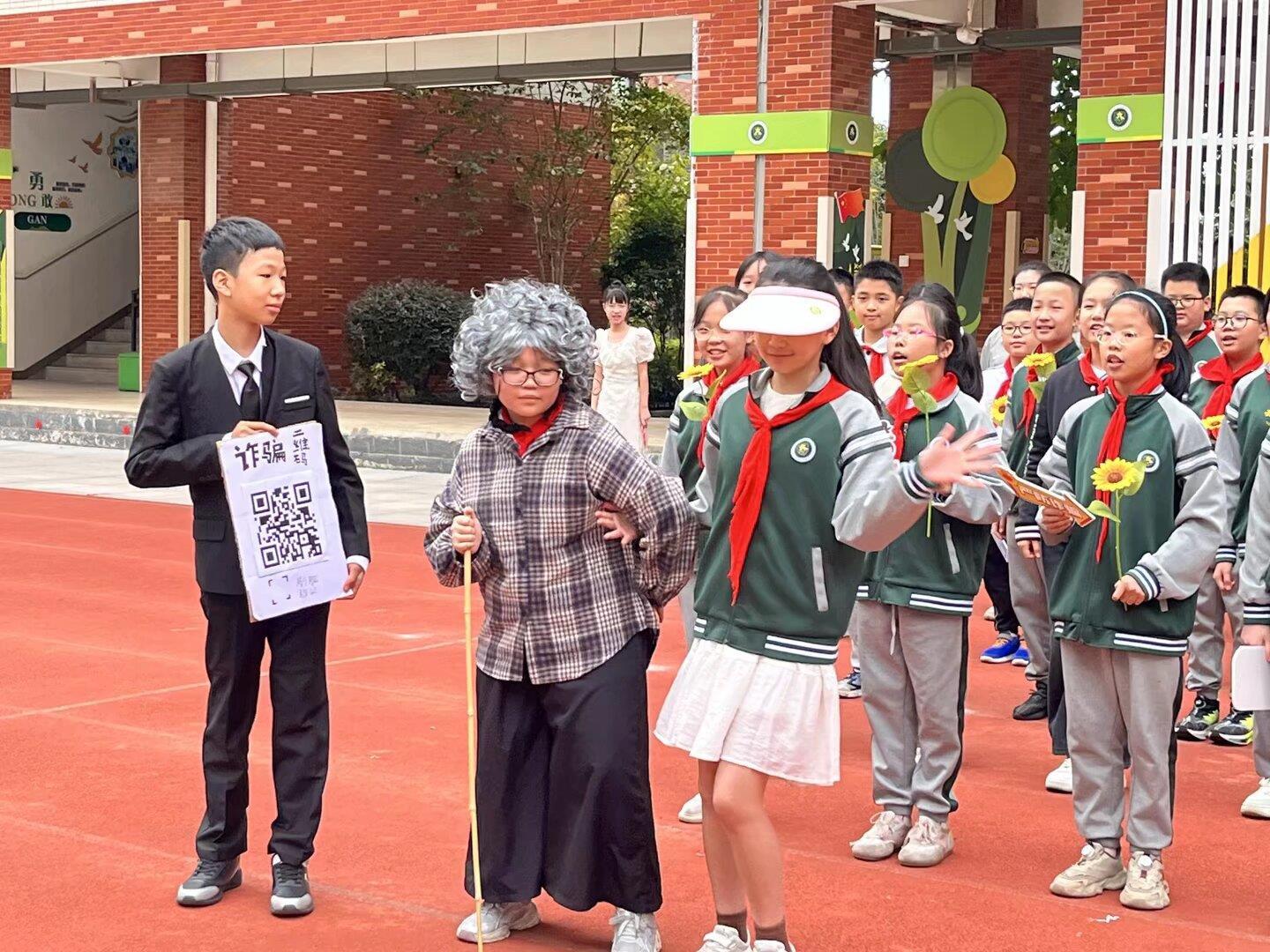 活动现场,队旗迎风招展,各中队的安全主题展示轮番亮相,形式新颖、亮点十足。防溺水教育环节,队员们手持自制的安全标语牌,伴着朗朗上口的口诀做起手势操——每一个动作都精准对应一条安全准则,将“防溺水六不准”化作生动记忆刻进脑海;国土安全教育板块,数十名队员手举各省代表牌有序列队,一面巨大的国旗在全体师生的注视下从操场中心缓缓飘过,大家齐唱国歌,在庄重的氛围中感悟“国土不可分割”的深刻内涵;网络安全宣传则以一场生动的歌舞剧拉开帷幕,队员们用优美的舞姿、鲜活的剧情,将网络陷阱的隐蔽危害与自我保护技巧直观呈现;心理健康教育展台前,“情绪小剧场”正在热闹上演,队员们通过情景再现,学习如何理性化解同学矛盾、有效缓解学习压力。