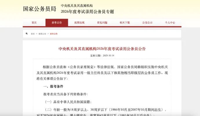 记者10月14日从国家公务员局获悉,中央机关及其直属机构2026年度考试录用公务员报名即将开始,共计划招录3.81万人。