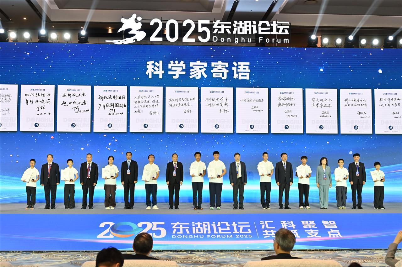 东湖实践环节,李德仁、丁烈云、丁荣军、谢先启、孙和平、李培武、杨春和、金梅林八位院士依次登台,为10名荣获2025年度全国青少年创·造实践活动东湖特别奖的代表赠送手写寄语。