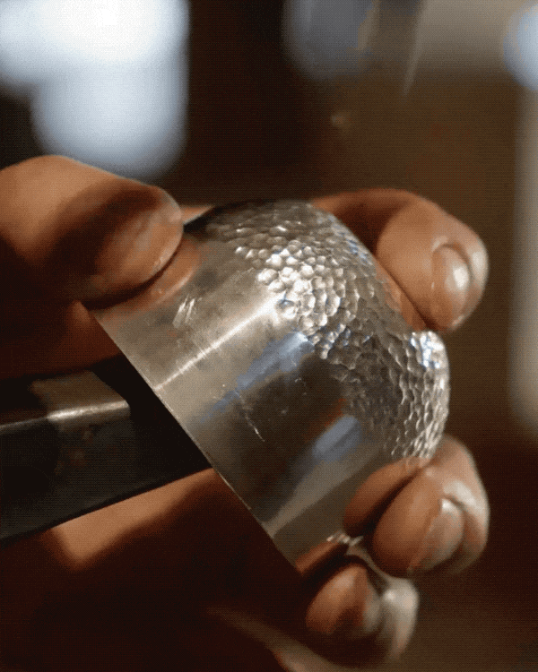 各种不同用途的金属器皿都可以敲打出这样的锤纹表面,除了上图的酒杯,下图金戒指的锤纹表面也是常见的经典款。
