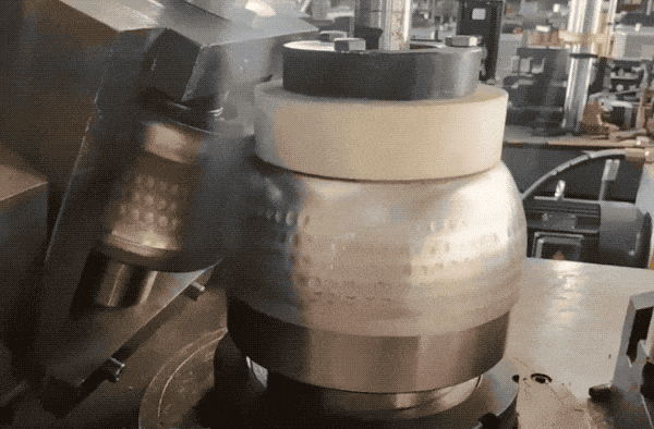 一种方法和之前做压纹杯具一样,把锅具套在有纹路的模具上,给锅具的内外都硬生生挤压出片片雪花纹得效果。