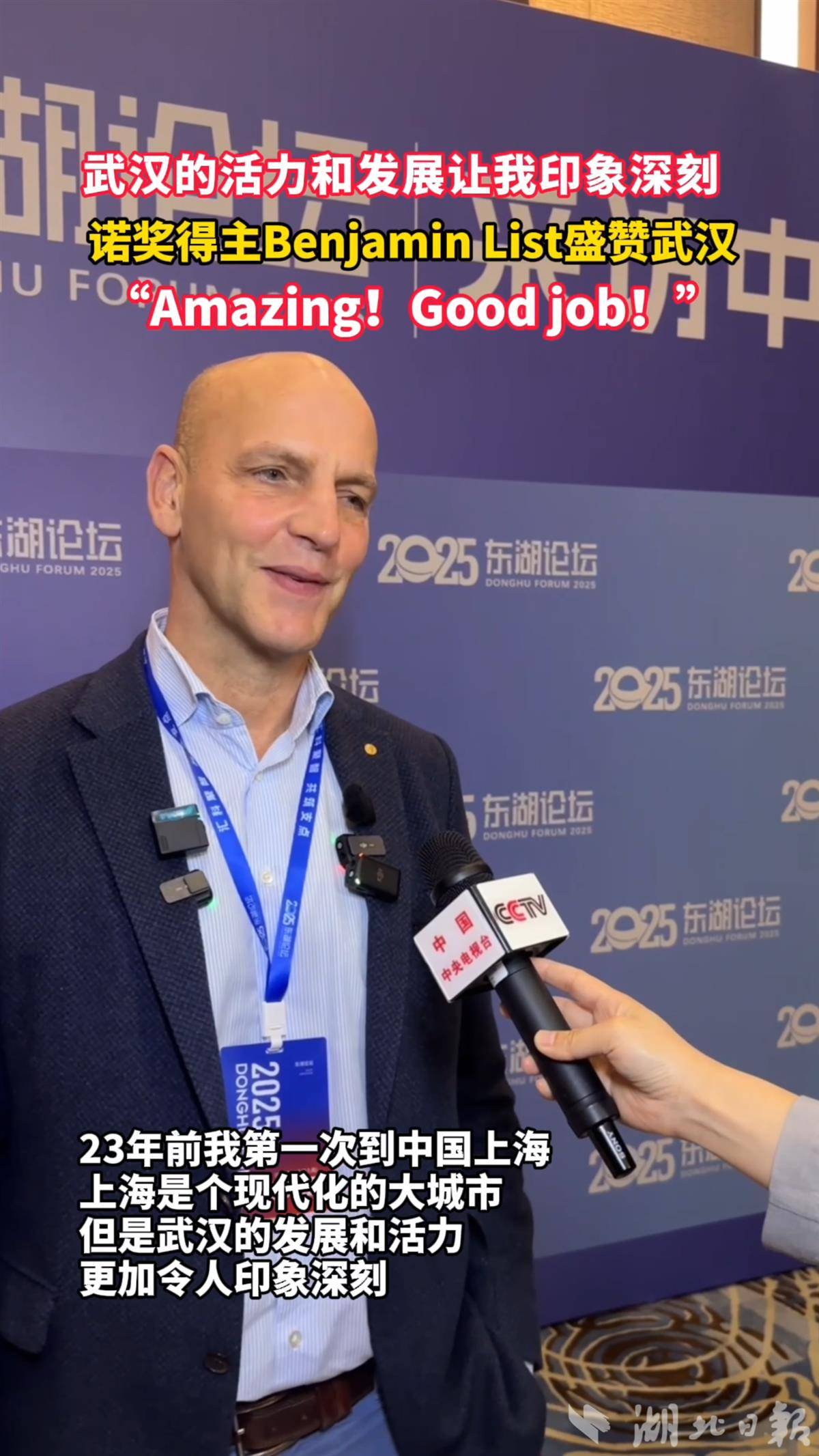 湖北日报讯(记者孙凌、实习生邓婷婷)10月14日,2025东湖论坛在武汉中国光谷科技会展中心开幕。参会的2021年诺贝尔化学奖获得者Benjamin List教授介绍,他23年前第一次到中国上海。他说,上海就是个现代化的大城市,但是武汉的发展更加令人印象深刻,武汉的发展速度和活力让我惊叹。面对央视采访镜头,他说盛赞武汉:“Amazing!Good job!”
