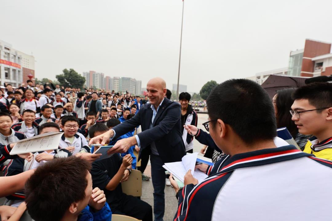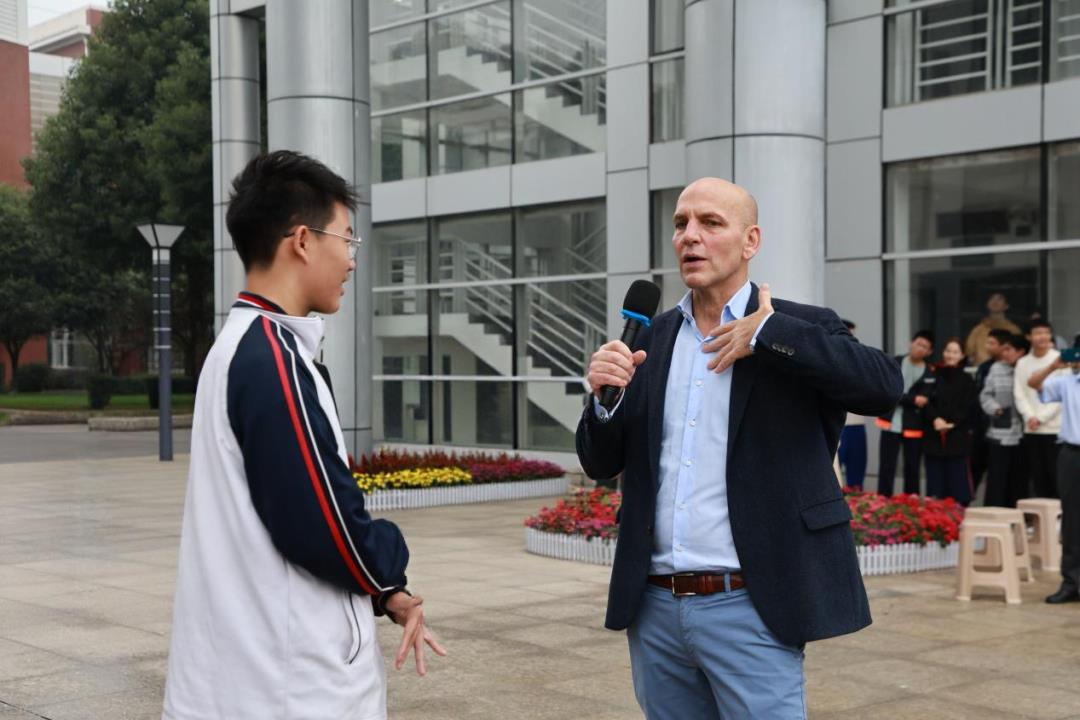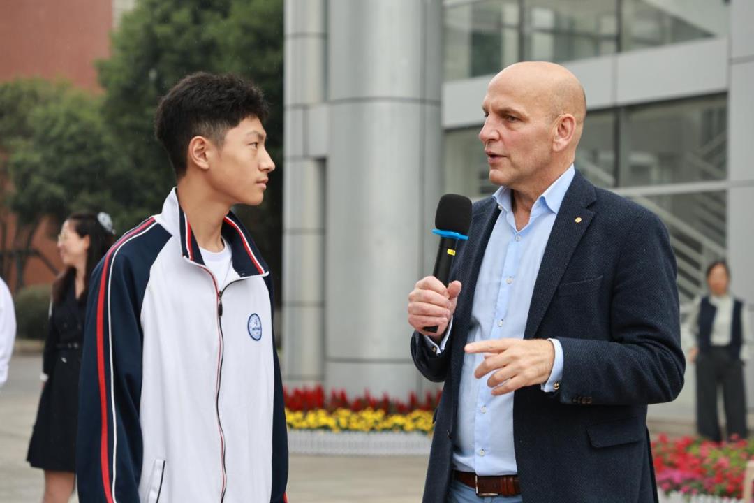 漫步校园期间,李斯特教授不时驻足,对校园庄重而优美的环境表示赞赏。他愉快地分享,早在来访之前就听闻华师一附中是中国顶尖中学之一,为此他感到十分高兴,也倍感荣幸能来到学校与师生交流。交谈中,他特别关心学校的生源构成,徐惠校长就此作了详细介绍。