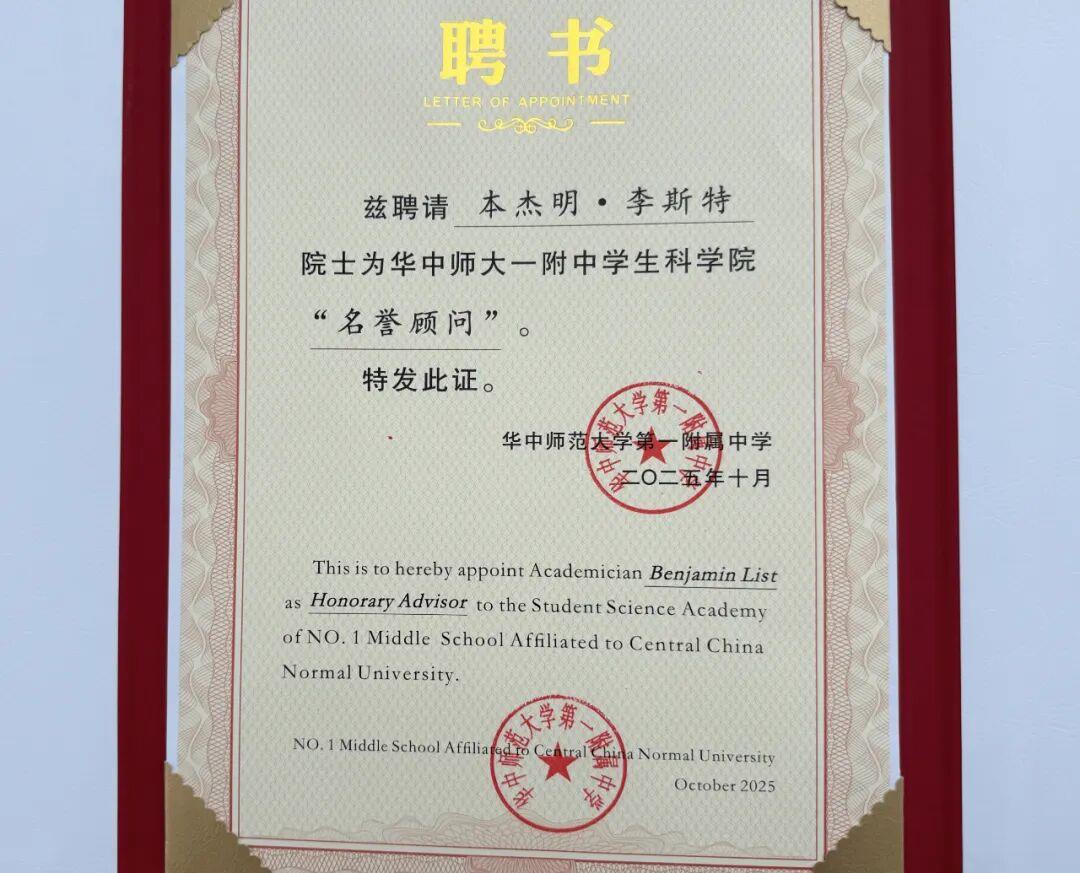在全校师生的共同见证下,杨国红书记与徐惠校长共同为本杰明・李斯特教授颁发“华中师大一附中学生科学院名誉顾问”聘书。这一荣誉的授予,标志着国际顶尖科学家正式加入学校科学教育指导团队,为华中师大一附中的发展搭建起一座通往全球科学前沿的桥梁。