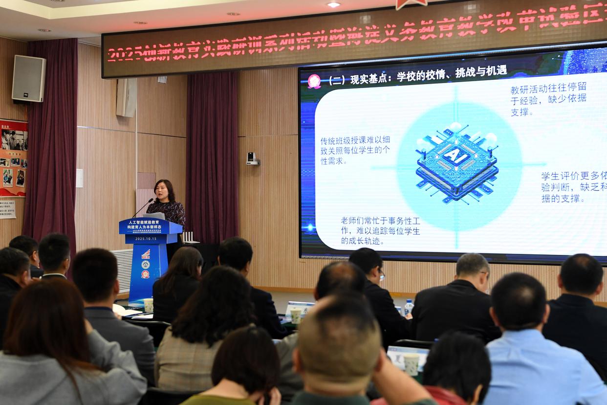 10月15日,北京市海淀区第四实验小学校长王亚苹进行主题发言,介绍学校将人工智能技术用于教学的经验。新华社记者 马宁 摄