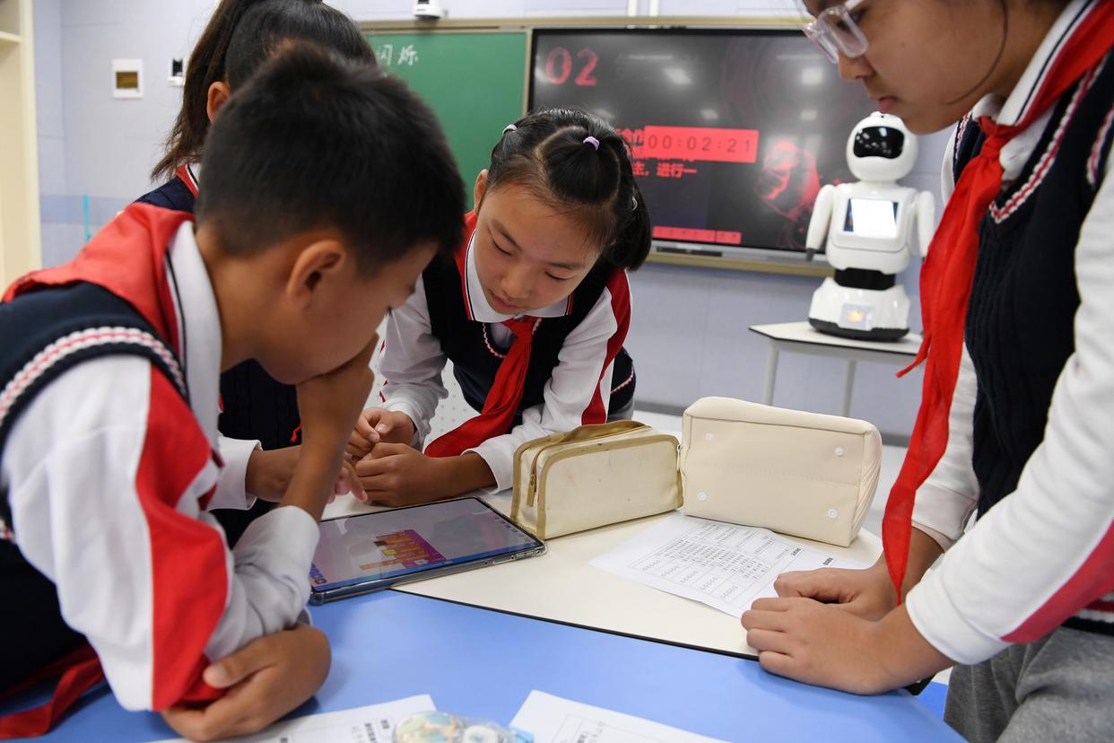 10月15日,在北京市海淀区第四实验小学《闪烁信号》主题人工智能公开课上,学生通过自己编写的程序向机器人发指令。新华社记者 马宁 摄