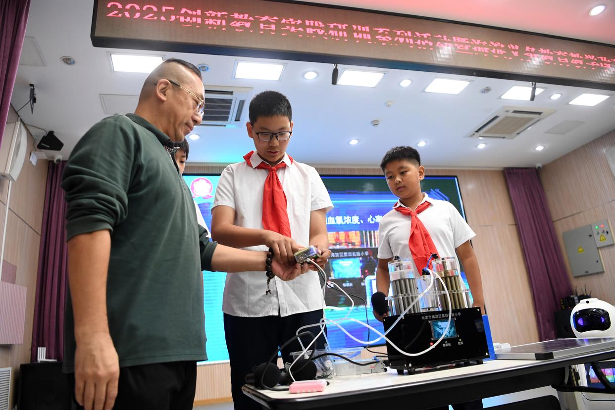 10月15日,在北京市海淀区第四实验小学,人工智能社团的学生用其制作的“极客氢氧太阳能保健机”为现场嘉宾进行健康监测。新华社记者 马宁 摄