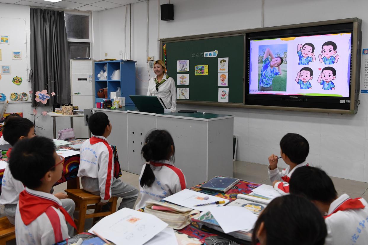 10月15日,在北京市海淀区第四实验小学《欢乐的游乐园》主题美术公开课上,老师展示利用AI技术生成的学生漫画形象。新华社记者 马宁 摄
