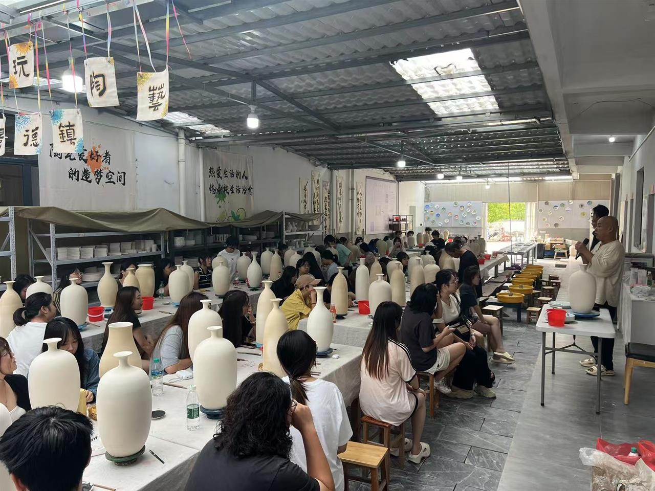 这是该院今年9月开始的实习环节新尝试——将大二本科生的必修课《采风与民族艺术考察》开到景德镇,每天上午参观陶瓷博物馆、陶瓷工厂,下午由当地的艺术大师现场授课和指导创作。