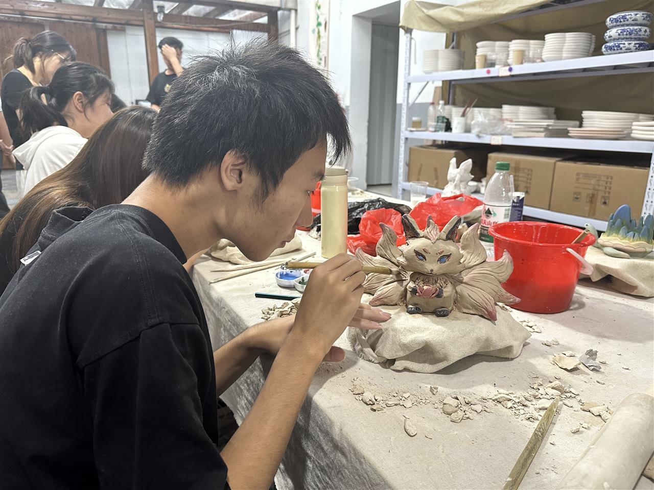 徐初泽拿起一件陶瓷作品,讲授陶瓷的工艺要求。“作品不能太薄,否则不成型;必须空心,否则会塌;里外通气,否则会炸。”接着边创作边讲解,先用泥土打底板,然后用泥条塑形,用吹风机快速吹干后,用报纸把中间撑起来,再捏制细节,最后上色。