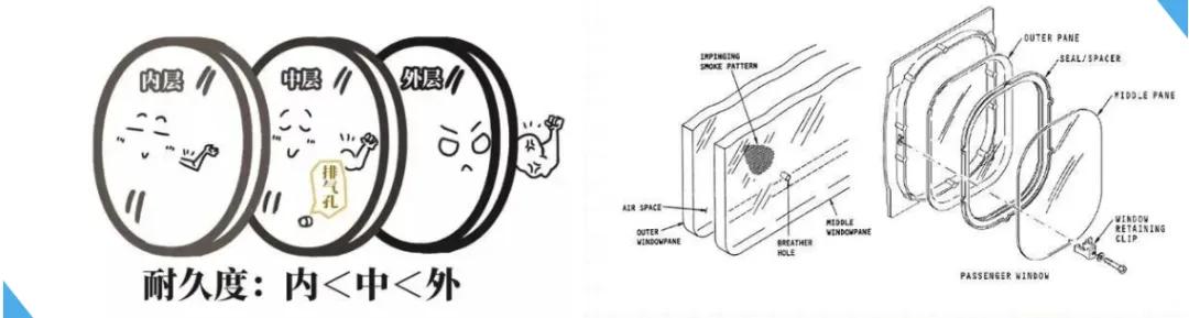 既然这个洞是特别设计的,那么要想搞清楚它被这样设计的原因,就得先知道飞机舷窗玻璃的所受到的工况和结构。在飞机飞行高度一万米左右时,舱外空气稀薄,仅有0.2-0.3个大气压,而机舱内采用增压的方式保持接近地面的气压,供乘客呼吸舒适。与家用单层玻璃不同,飞机为了承受更多压力,工程师为飞机机窗设计出三层构造,分别为外层、中层和内层。