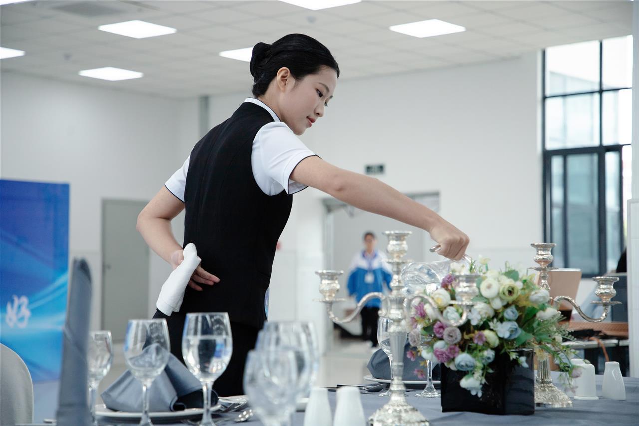 “西餐容易超时,刀叉部分特别容易摆歪。”江可昕同学坦言,尽管备赛时间仅半个多月,但比赛是对心理素质、应变能力和专业技能的全方位锻炼。西餐摆台节奏控制尤为关键,“一旦节奏慢了,后面就容易超时”。所有操作环节,从铺桌布到斟酒倒水,均有明确的厘米级距离标准,考验的是选手对职业规范的深刻理解与严格执行。