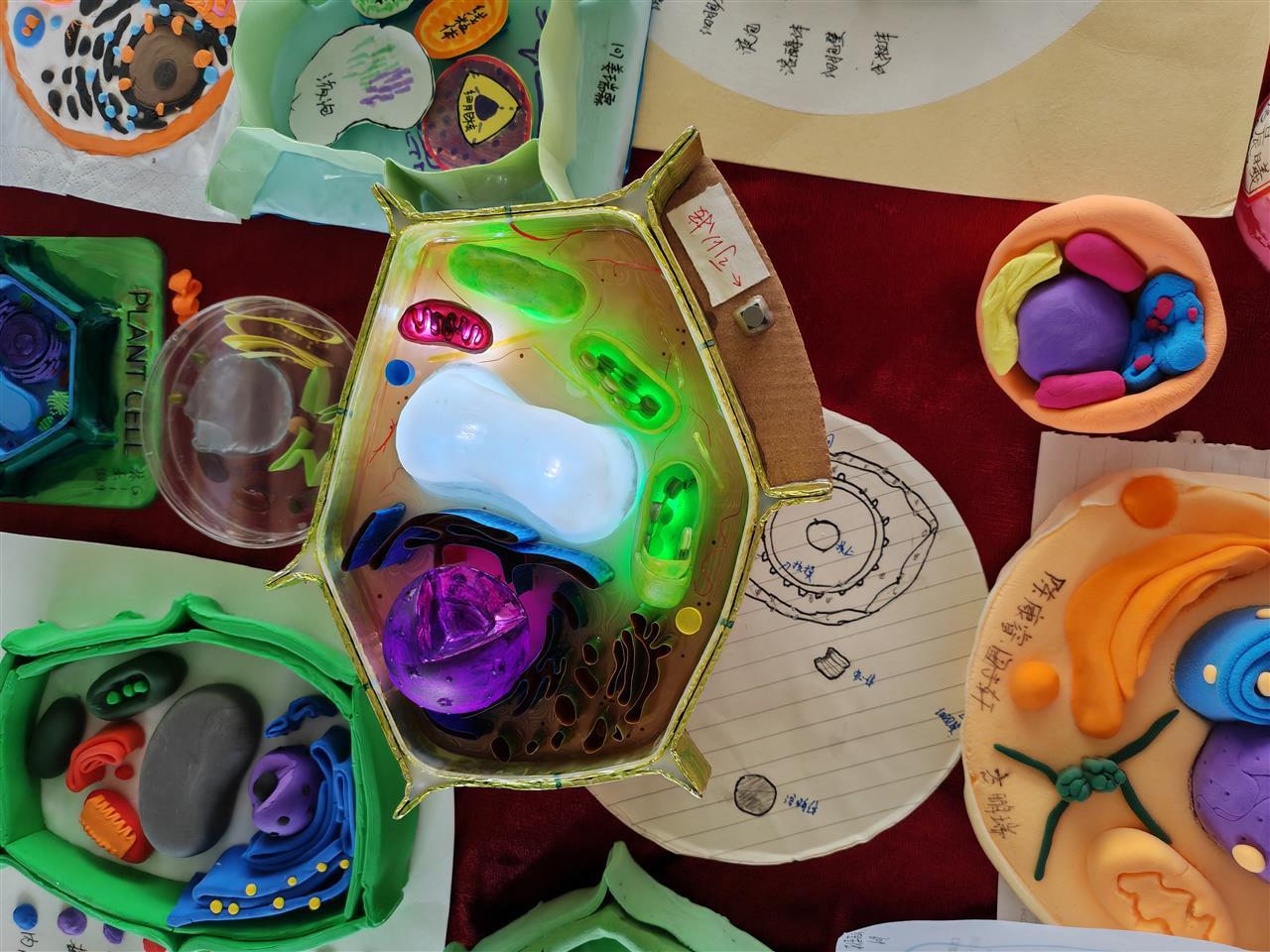 高一(1)班罗琦皓的作品则展现了他的“硬核”动手能力和跨学科思维能力。他利用两层细瓦楞纸板堆叠制作细胞壁,用UV胶灌注定型,更巧妙的是,他结合初高中所学的电学知识,自学焊接,将LED灯珠嵌入到各细胞器的内部。“下面是我的电池,还有我连接的电路。”他自信地介绍道。当灯光亮起,叶绿体、线粒体等结构在透明的细胞质中清晰显现,仿佛一个被点亮的生命工厂。